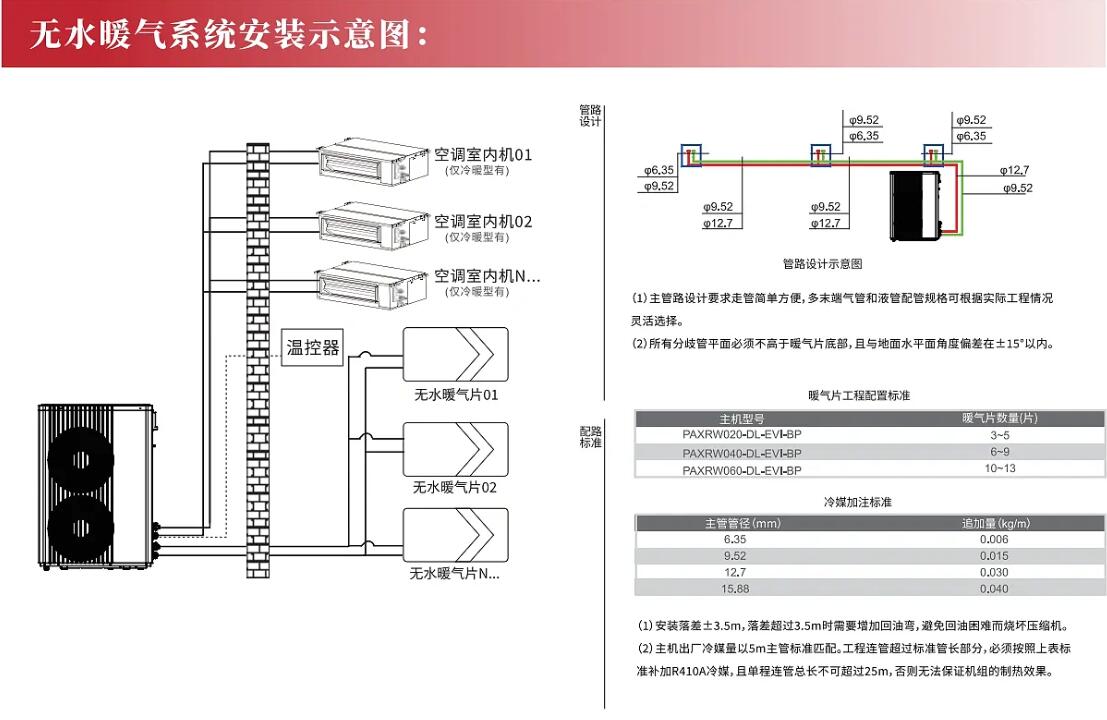 連接管道:從變頻室外主機到無水暖氣片之間需要有管道連接。這些管道應使用保溫材料包裹,以減少熱量損失。